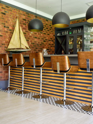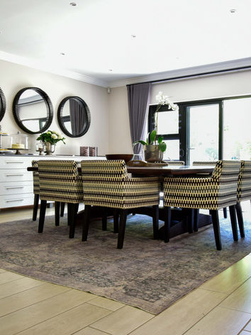 There are some unique modern design elements like the oversized waterfall island in the kitchen, the large black & copper lights above the bar area, the furniture which I had matte black sprayed and 3 large coq round mirrors, as well as a host of features from the floating wall units and the layout of the lounge area. Further interest is created with a patterned black and white tile around the bar area, a mirrored bathroom aluminium door and brick tiles at the front door. Whilst there are too many elements to mention, the end product is a modern house mixed with classical elements that still remains a family home.
